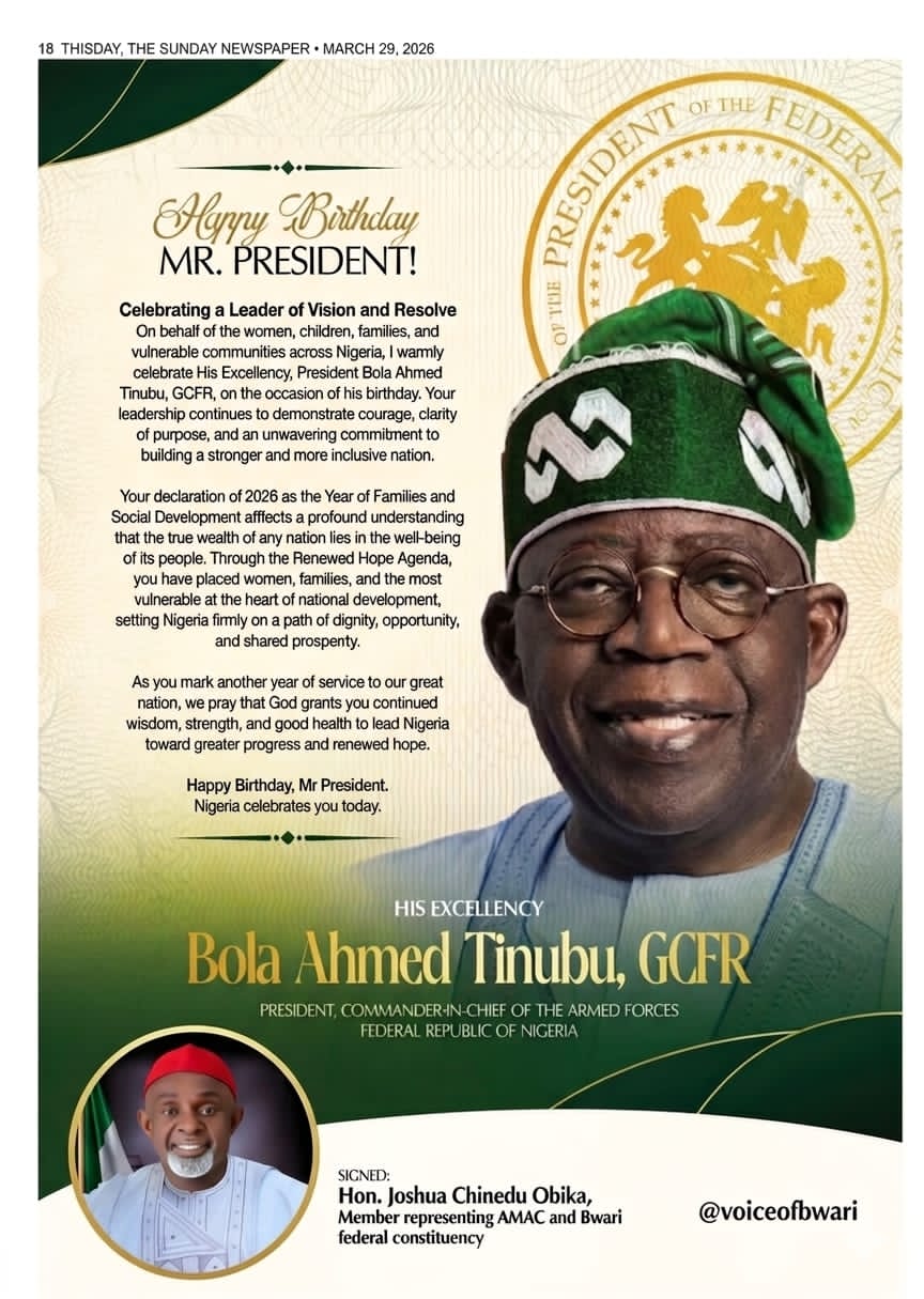 Hon. Joshua Chinedu Obika, Member representing AMAC/Bwari Federal Constituency, FCT Abuja, has extended his warm congratulations to President Bola Ahmed Tinubu on the occasion of his birthday.