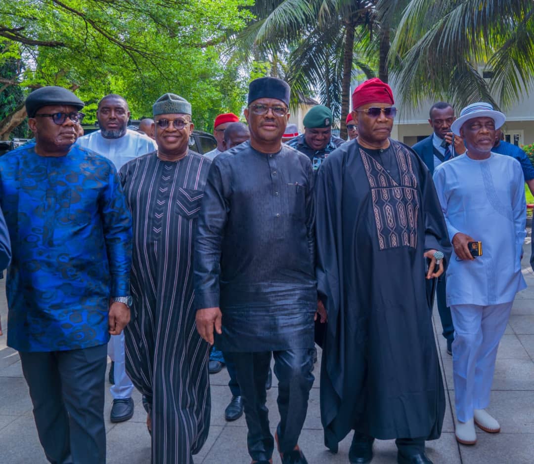L-r Executive Director Projects, Niger Delta Development Commission (NDDC), Sir Victor Antai; National Vice-Chairman of the APC, South South, Chief Dan Orbih; Minister, Federal Capital Territory (FCT), Nyesom Wike; President of the Senate, Godswill Akpabio and Senate Minority Leader, Abba Morro, during their visit to Wike’s residence in Port Harcourt, after the interment of Senator Barinada Mpigi, on Saturday in Tai Local Government Area of Rivers State. Photo: Senate President’s Office